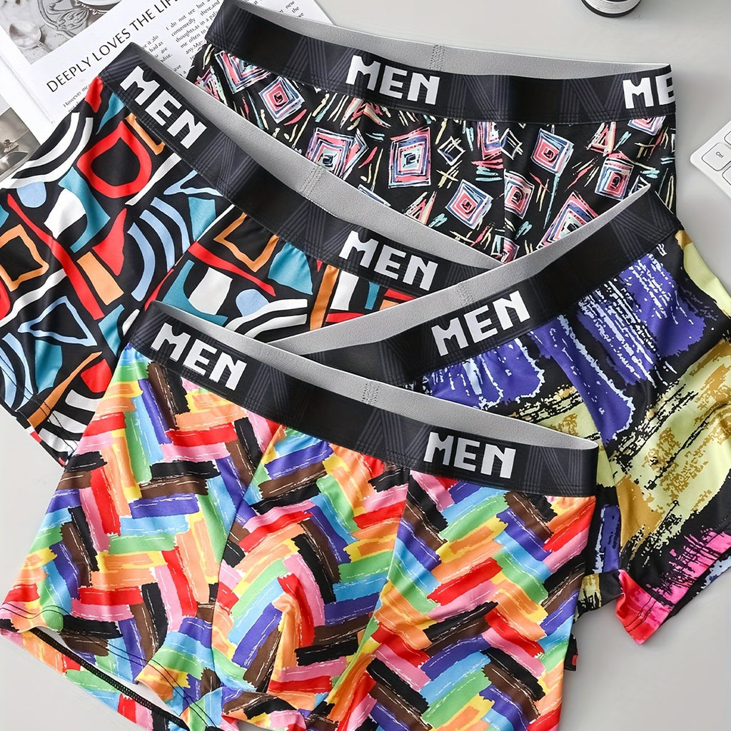 Stylish High Quality Series - 4 Pcs Men's Colorful Geometric Print Stretchy Boxer Briefs - Comfy & Quick- Drying & Breathable Underwear Set - S、M、L、XL、XXL