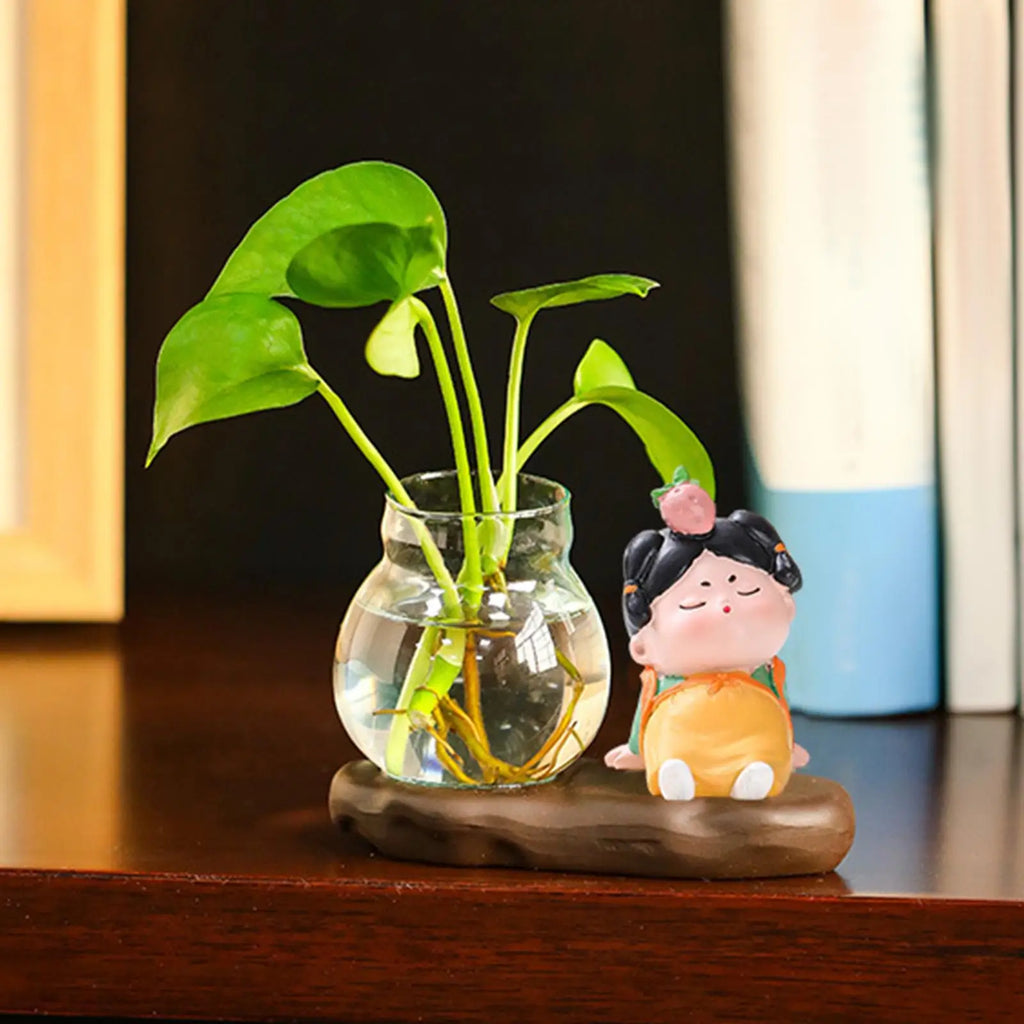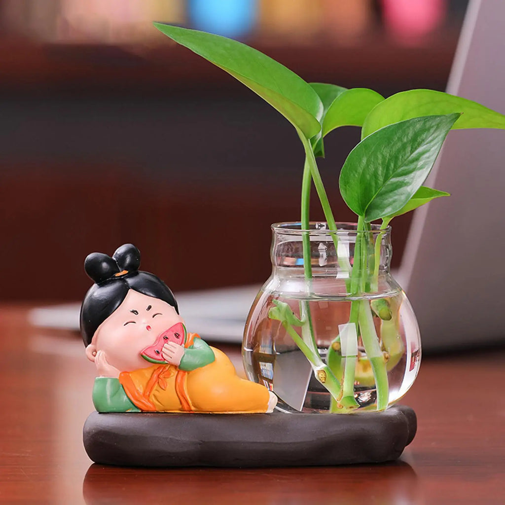 Creative Cute Tang Lady Hydroponics Flower Vase with Resin Stand Clear Glass
